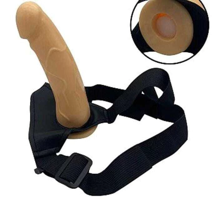 Cinta com Capa realística em formato de pênis com alça que se adapta a qualquer grossura de perna e quadril.
