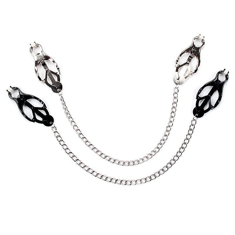 O prendedor de mamilos possui ajustes e guizo de metal.